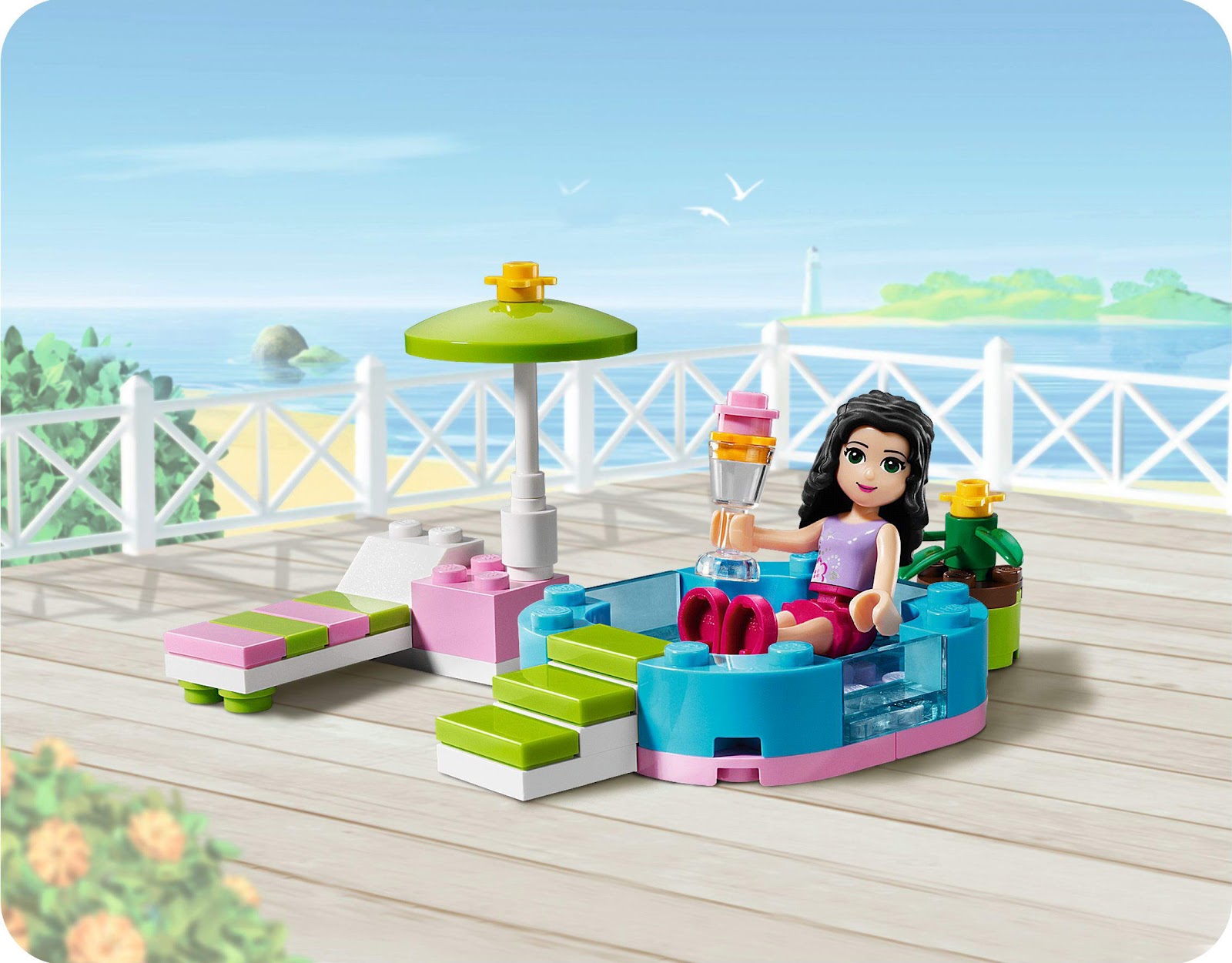 the pool has a lounge chair, an umbrella, an ice cream dish and a small plant.